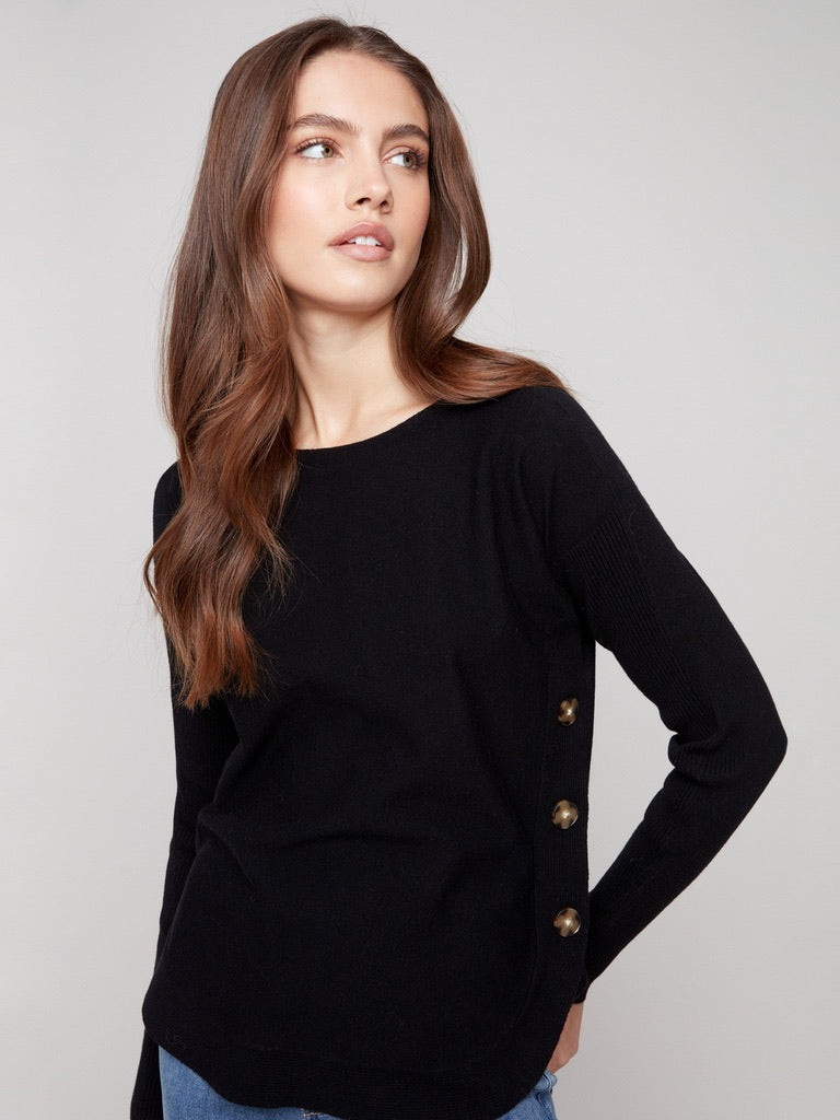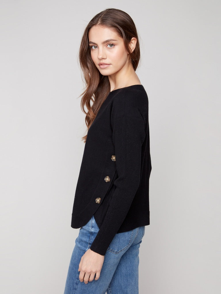 This boat neck sweater is a versatile piece for any wardrobe. Featuring charming side button details and made from a soft fabric blend, it combines comfort with style. Whether worn with jeans for a casual look or paired with a skirt for something dressier, this sweater embodies timeless fall fashion.