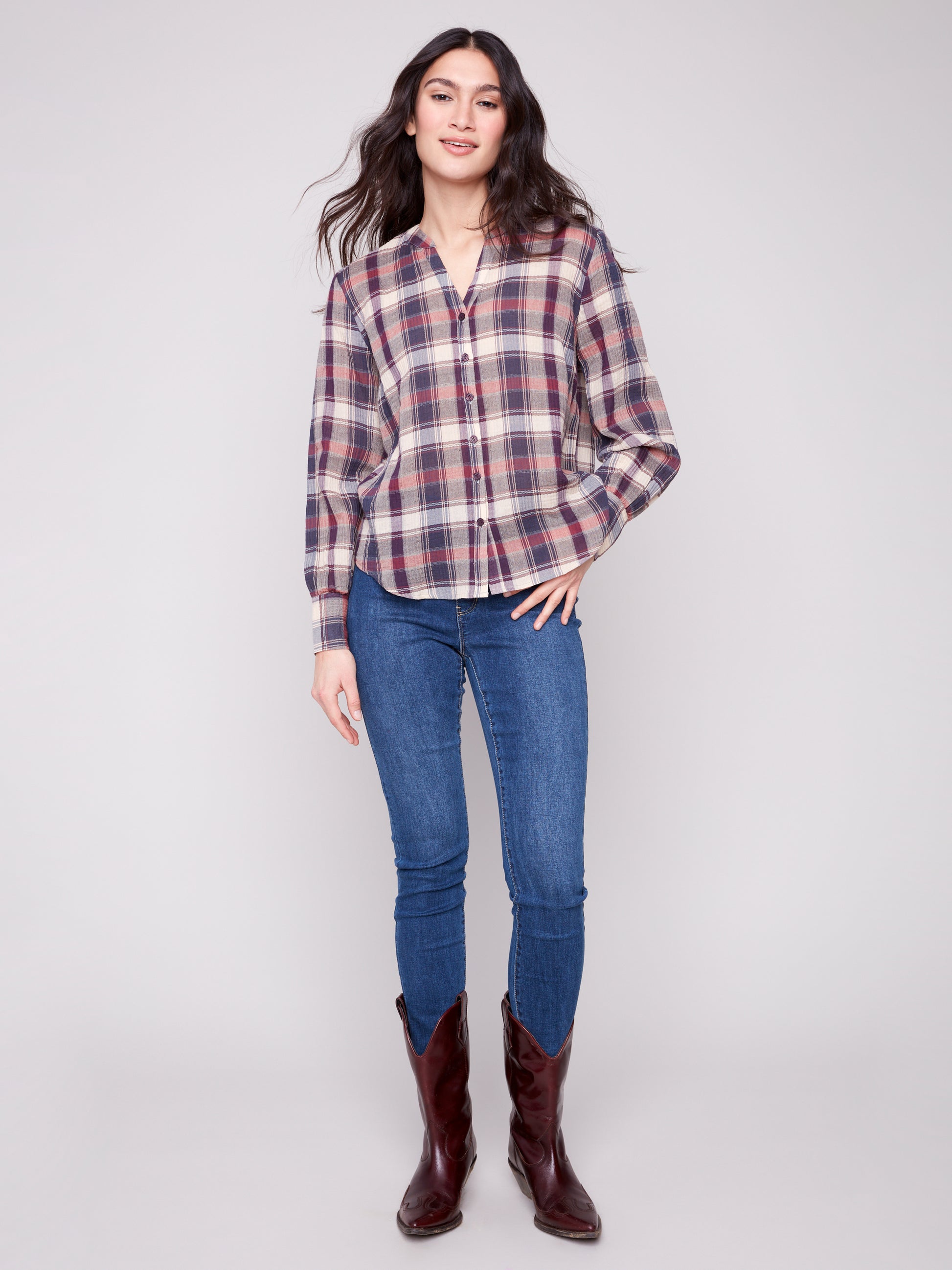 This cotton blouse is the perfect addition to any fall wardrobe. The colours work back to all of our Charlie B fall and winter collection. It features a slightly crinkled fabric and a fashionable scoop hem.