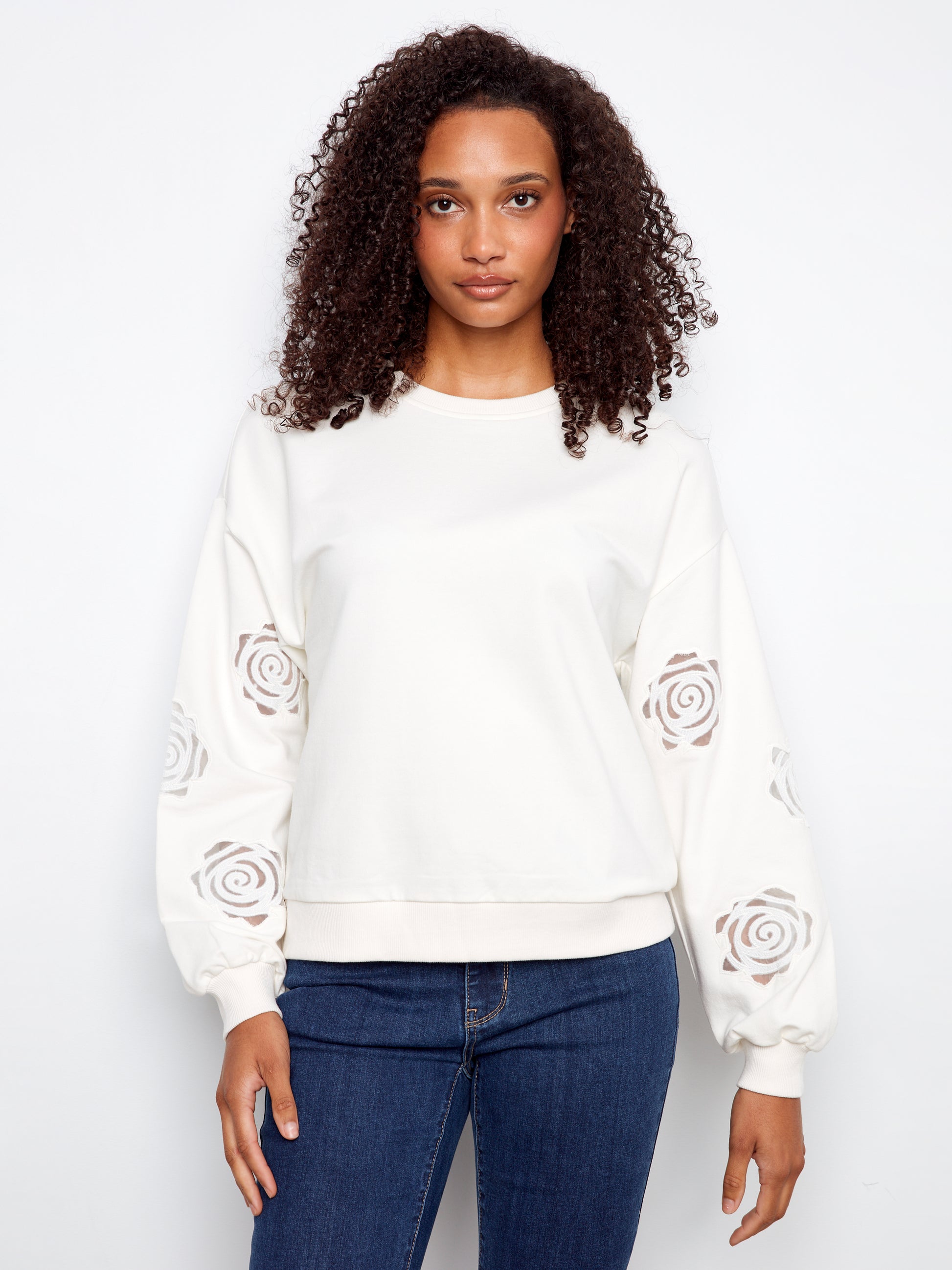 Step into spring with our French Terry top, featuring unique sleeve embroidery and a comfortable crew neckline for an effortlessly elevated casual look. Crafted from stretchy French Terry fabric, it offers a flattering fit that perfectly blends style and comfort.