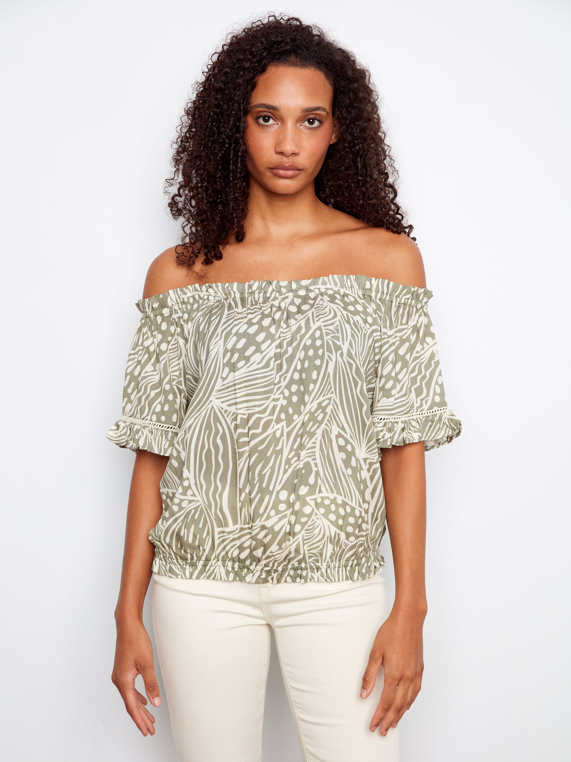 Take your spring and summer wardrobe to the next level with this off the shoulder printed blouse. It features elastic at the neck and hem and a sweet ruffle short sleeve.