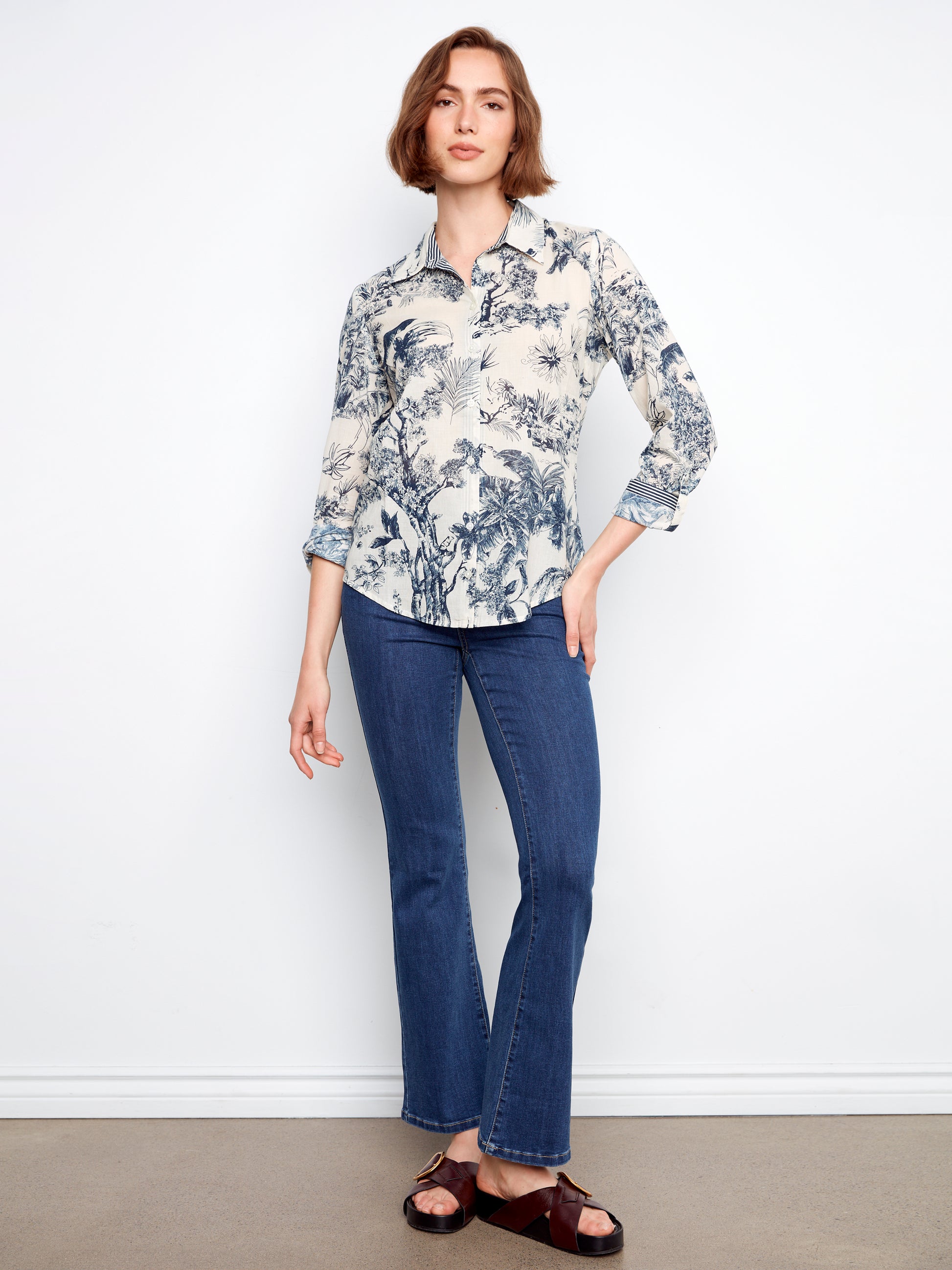 Refresh your spring wardrobe with our Printed Cotton Voile Button-Up Blouse, adorned with a beautiful Versailles print in dark blue that flows gracefully across the fabric. Featuring a shirt collar and long sleeves, this blouse exudes effortless elegance, while its lightweight, breathable cotton ensures all-day comfort. Perfect for any occasion, it’s a must-have piece for the season.