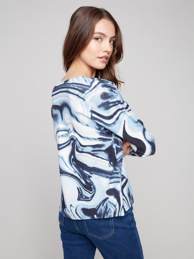 Indulge in plush comfort this fall with our plush V-neck sweater. Crafted from ultra-soft knit fabric, it features a striking abstract blue swirl design and stylish drop shoulders. This statement piece effortlessly blends bold style with cozy elegance—your new go-to for casual autumn looks.