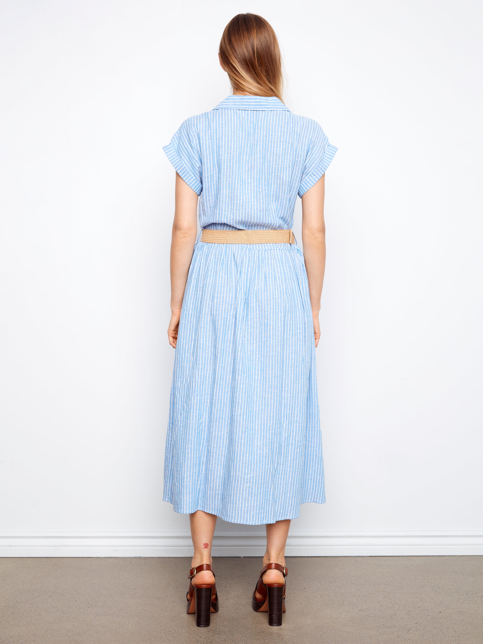 This classic styling is sure to take you anywhere you need to go this spring and summer. It features hidden side pockets, cap sleaves, wood buttons, and a lovely woven belt.