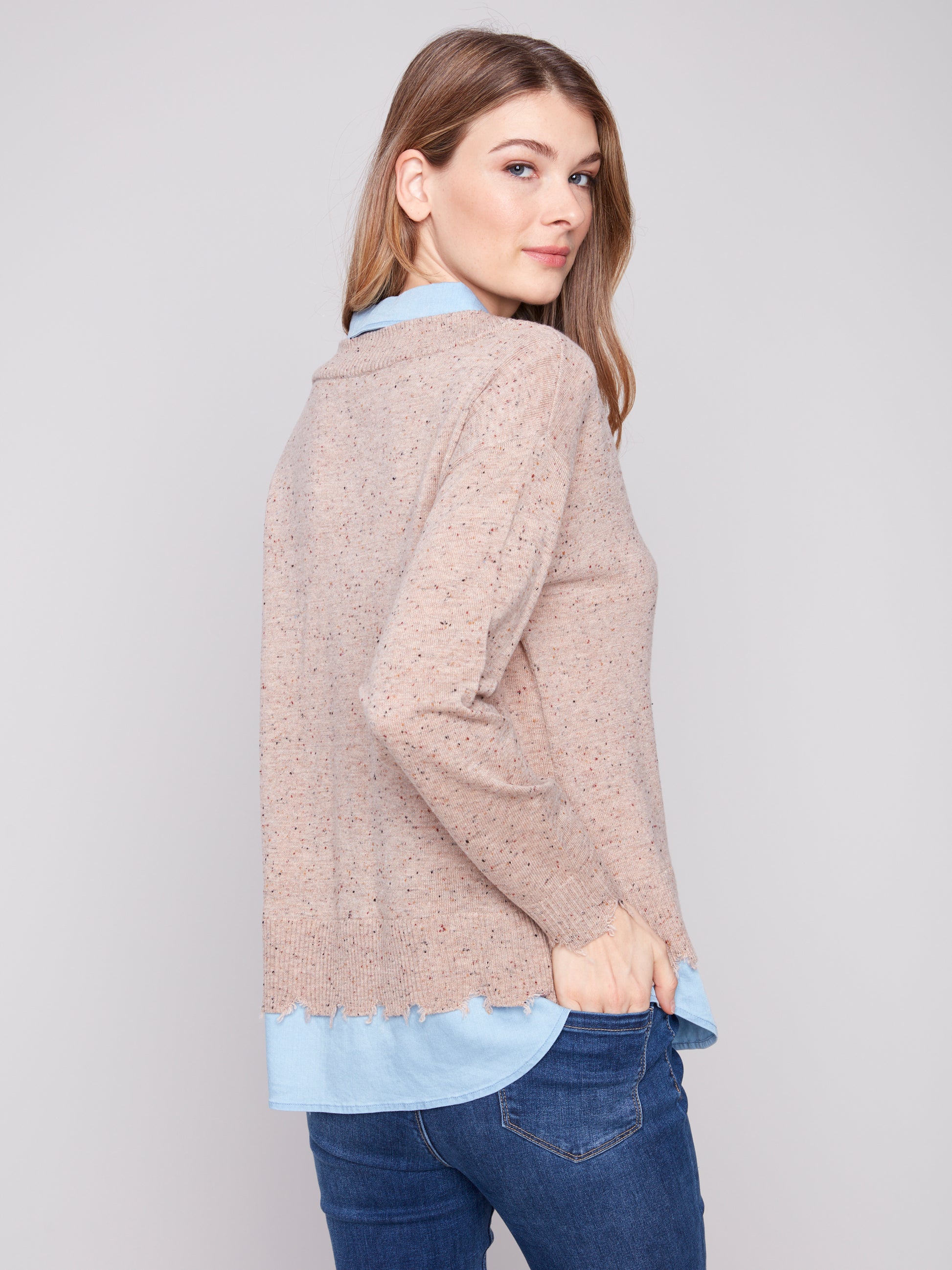 Stay ahead of the trend with this fooler sweater that gives the illusion of layering without the bulk. The fooler style combines a sleek v-neck sweater with the look of a shirt underneath, making it perfect for a smart-casual appearance. The blend of soft materials provides comfort and exquisite draping. The shirt detail peeking out of the hem and cuffs gives it a modern, effortless aesthetic.