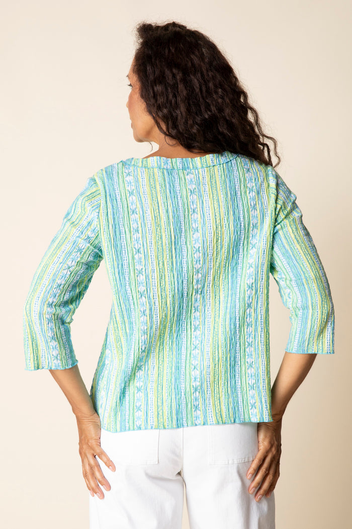 Cool and crisp, our crinkle cotton has a touch of spandex for ease. Special details include angled front overlay seam, front pocket and artfully angled hem. Edge stitching on all seams highlights the shape and elongates the body. Exclusive stripe pattern. Travels well, no iron needed.