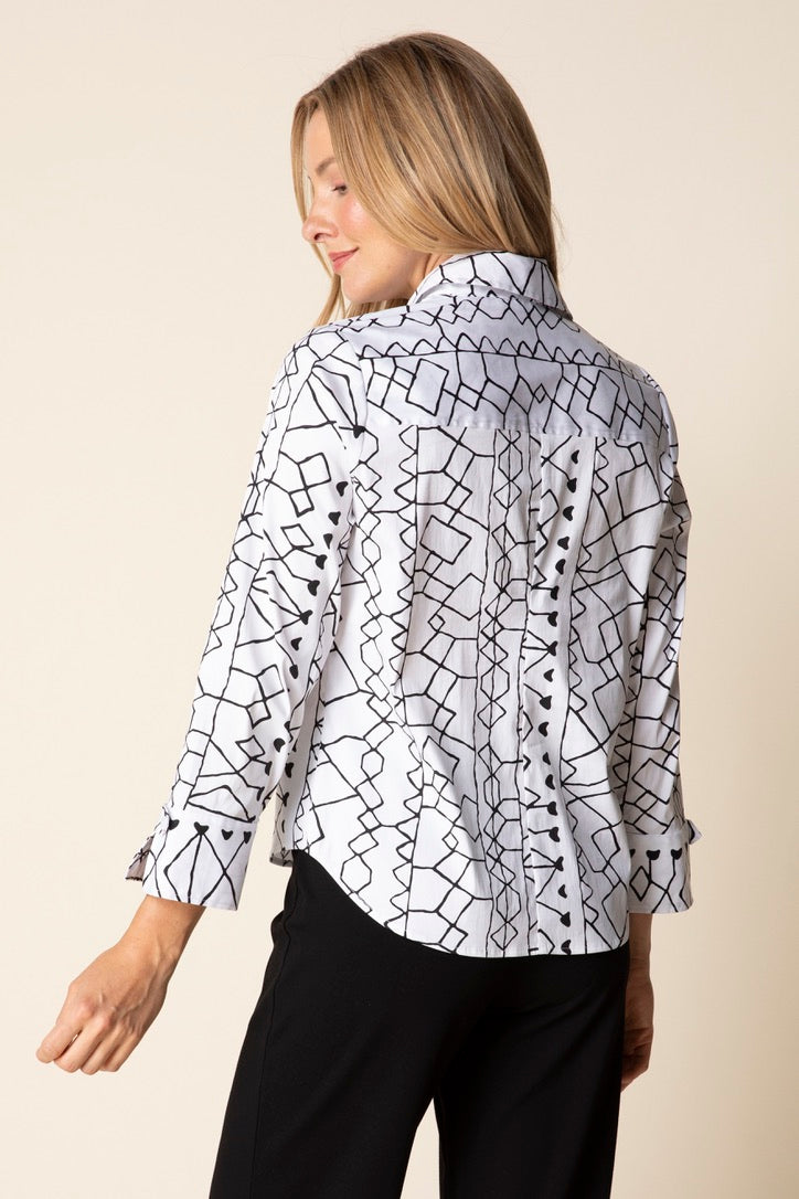 This print blouse features tab details not only on the front placket but also on the cuffs.