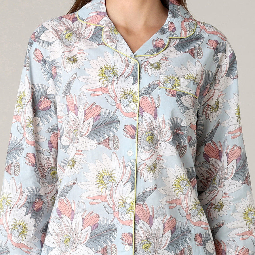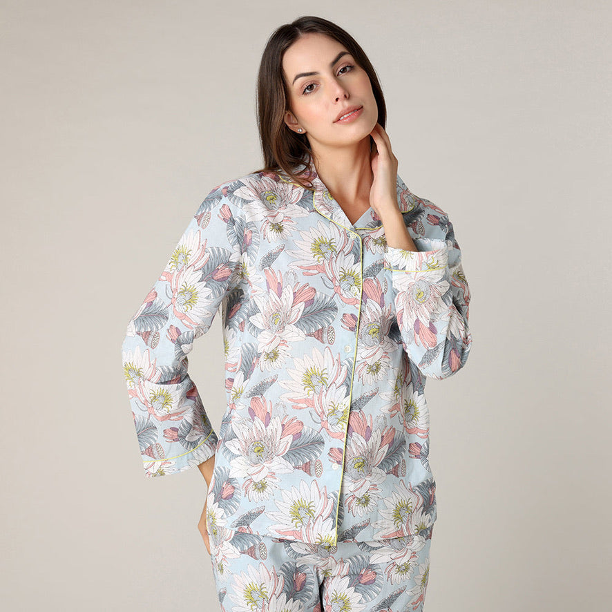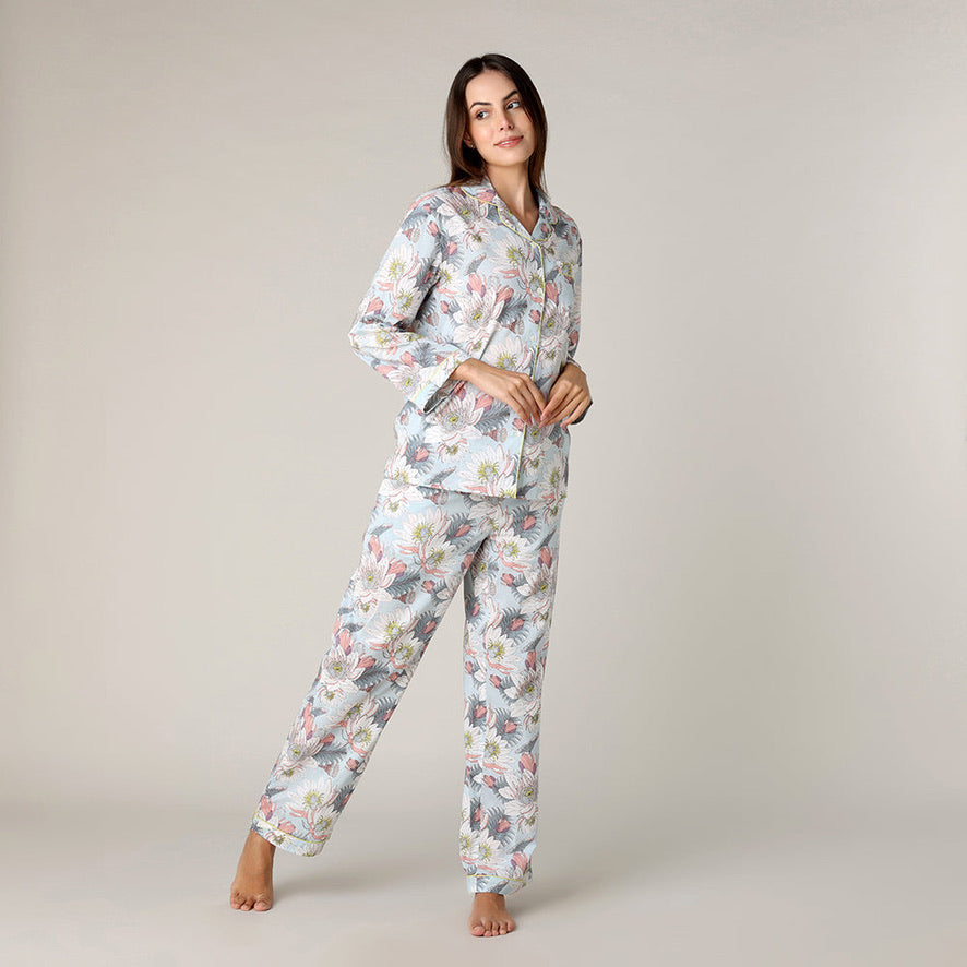 Hand screen printed on lightweight fabric. Notch collar Pj top with pocket and piping details. Pj bottom a has drawstring as well as an elastic waist, with pockets and piping details.
