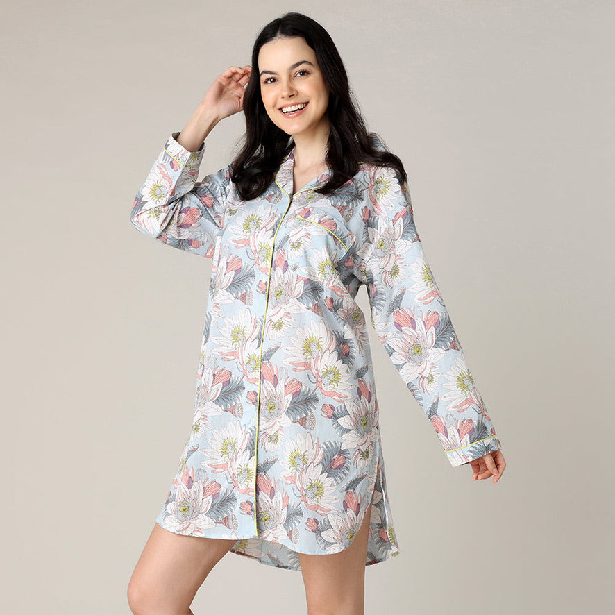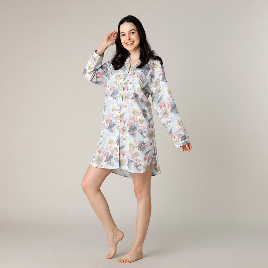 Hand screen printed on lightweight fabric. Notch collar nightshirt with pocket and piping details.