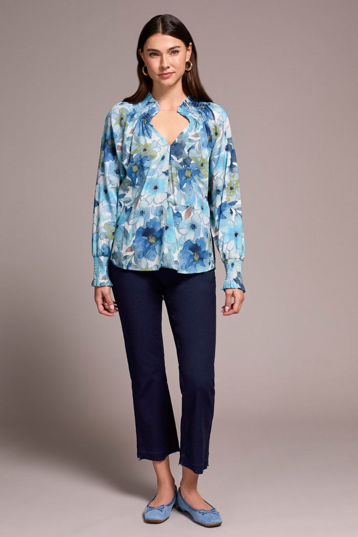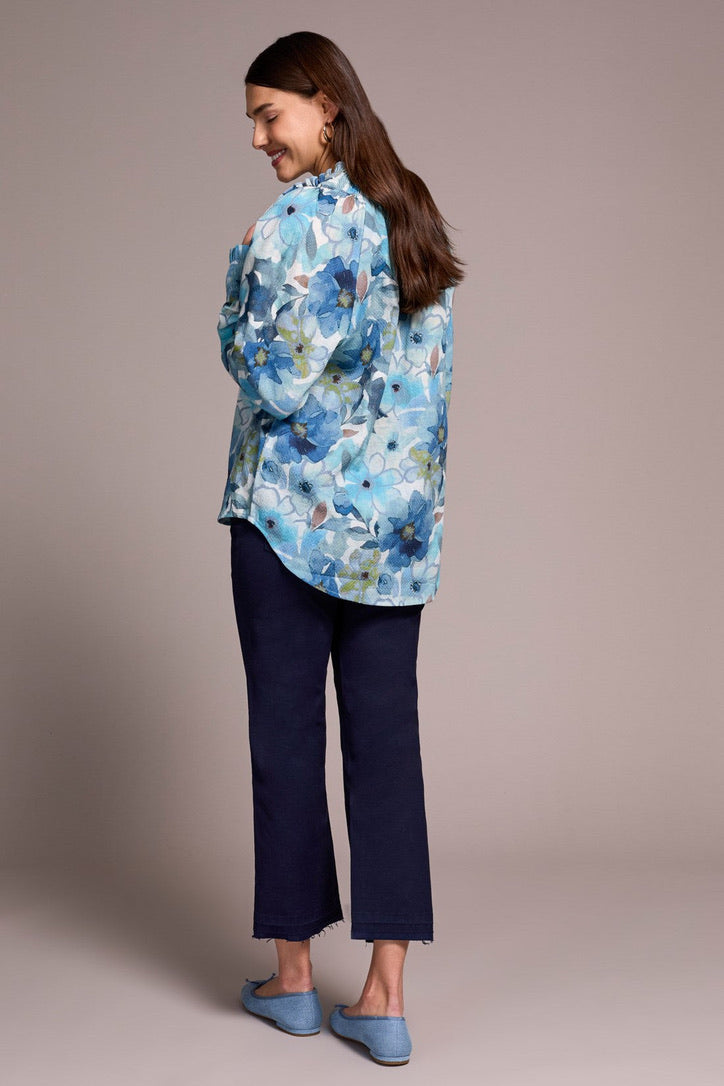 Add a burst of vibrant charm to your outfit with this relaxed blouse, adorned with a floral pattern and delicate mesh accents. The mock detail along the neckline and sleeves enhances the flattering silhouette of this easygoing pop-over style.